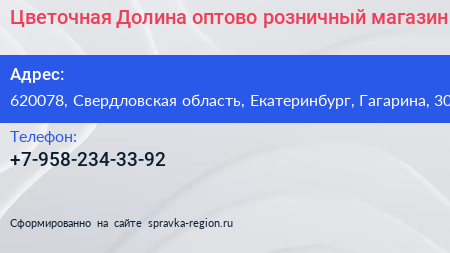 Цветочная Долина, оптово-розничный магазин по адресу 620078, Свердловская область, Екатеринбург, Гагарина, 30 в дальнейшем Организация, размещена в следующих категориях: