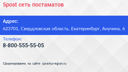 5post, сеть постаматов по адресу 623701, Свердловская область, Екатеринбург, Анучина, 6 в дальнейшем Организация, размещена в следующих категориях: