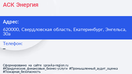 АСК-Энергия по адресу 620000, Свердловская область, Екатеринбург, Энгельса, 30а в дальнейшем Организация, размещена в следующих категориях:
