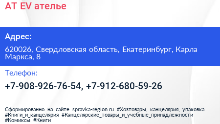 AT-EV, ателье по адресу 620026, Свердловская область, Екатеринбург, Карла Маркса, 8 в дальнейшем Организация, размещена в следующих категориях: