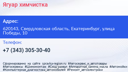 Ягуар, химчистка по адресу 620143, Свердловская область, Екатеринбург, улица Победы, 10 в дальнейшем Организация, размещена в следующих категориях: