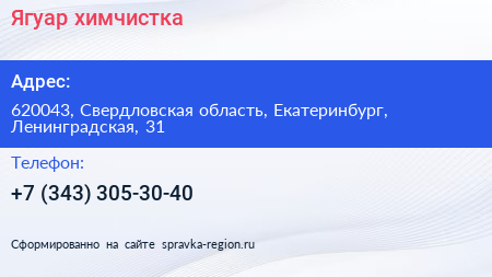 Ягуар, химчистка по адресу 620043, Свердловская область, Екатеринбург, Ленинградская, 31 в дальнейшем Организация, размещена в следующих категориях:
