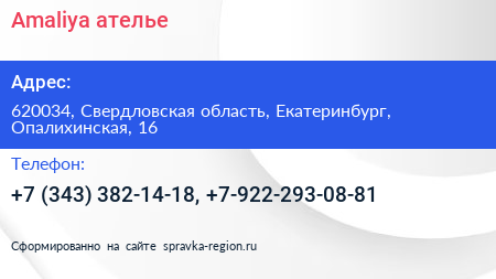 Amaliya, ателье по адресу 620034, Свердловская область, Екатеринбург, Опалихинская, 16 в дальнейшем Организация, размещена в следующих категориях: