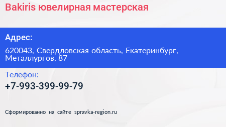 Bakiris, ювелирная мастерская по адресу 620043, Свердловская область, Екатеринбург, Металлургов, 87 в дальнейшем Организация, размещена в следующих категориях: