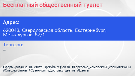 Бесплатный общественный туалет по адресу 620043, Свердловская область, Екатеринбург, Металлургов, 87/1 в дальнейшем Организация, размещена в следующих категориях: