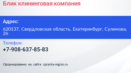 Блик, клининговая компания по адресу 620137, Свердловская область, Екатеринбург, Сулимова, 26 в дальнейшем Организация, размещена в следующих категориях: