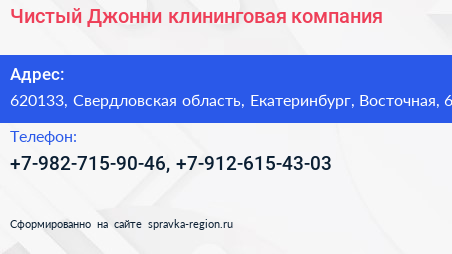 Чистый Джонни, клининговая компания по адресу 620133, Свердловская область, Екатеринбург, Восточная, 6 в дальнейшем Организация, размещена в следующих категориях:
