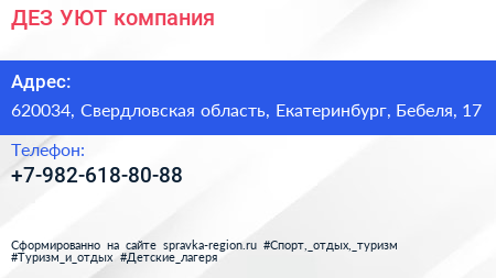 ДЕЗ-УЮТ, компания по адресу 620034, Свердловская область, Екатеринбург, Бебеля, 17 в дальнейшем Организация, размещена в следующих категориях: