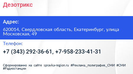 Дезотрикс по адресу 620014, Свердловская область, Екатеринбург, улица Московская, 49 в дальнейшем Организация, размещена в следующих категориях: