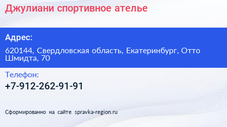 Джулиани, спортивное ателье по адресу 620144, Свердловская область, Екатеринбург, Отто Шмидта, 70 в дальнейшем Организация, размещена в следующих категориях: