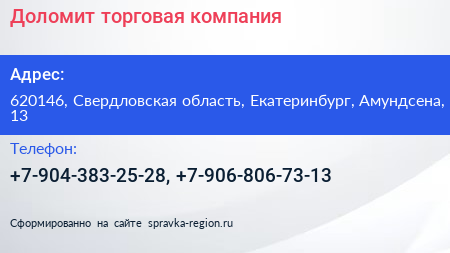 Доломит, торговая компания по адресу 620146, Свердловская область, Екатеринбург, Амундсена, 13 в дальнейшем Организация, размещена в следующих категориях: