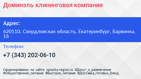 Доминэль, клининговая компания по адресу 620110, Свердловская область, Екатеринбург, Барвинка, 16 в дальнейшем Организация, размещена в следующих категориях: