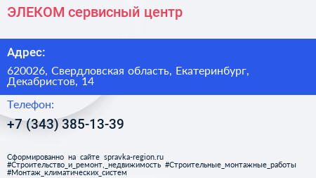 ЭЛЕКОМ, сервисный центр по адресу 620026, Свердловская область, Екатеринбург, Декабристов, 14 в дальнейшем Организация, размещена в следующих категориях: