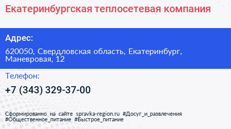 Екатеринбургская теплосетевая компания по адресу 620050, Свердловская область, Екатеринбург, Маневровая, 12 в дальнейшем Организация, размещена в следующих категориях: