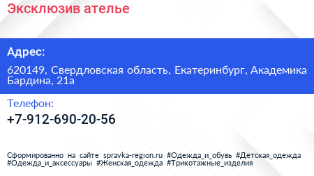 Эксклюзив, ателье по адресу 620149, Свердловская область, Екатеринбург, Академика Бардина, 21а в дальнейшем Организация, размещена в следующих категориях: