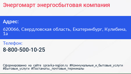 Энергомарт, энергосбытовая компания по адресу 620066, Свердловская область, Екатеринбург, Кулибина, 1а в дальнейшем Организация, размещена в следующих категориях: