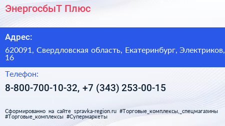 ЭнергосбыТ Плюс по адресу 620091, Свердловская область, Екатеринбург, Электриков, 16 в дальнейшем Организация, размещена в следующих категориях: