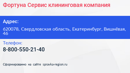 Фортуна Сервис, клининговая компания по адресу 620078, Свердловская область, Екатеринбург, Вишнёвая, 46 в дальнейшем Организация, размещена в следующих категориях: