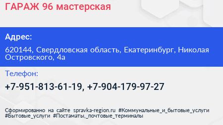 ГАРАЖ 96, мастерская по адресу 620144, Свердловская область, Екатеринбург, Николая Островского, 4а в дальнейшем Организация, размещена в следующих категориях: