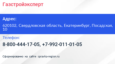 Газстройэксперт по адресу 620102, Свердловская область, Екатеринбург, Посадская, 10 в дальнейшем Организация, размещена в следующих категориях: