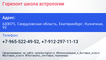 Горизонт, школа астрологии по адресу 620075, Свердловская область, Екатеринбург, Кузнечная, 92 в дальнейшем Организация, размещена в следующих категориях: