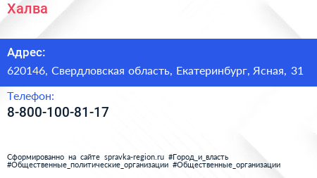 Халва по адресу 620146, Свердловская область, Екатеринбург, Ясная, 31 в дальнейшем Организация, размещена в следующих категориях: