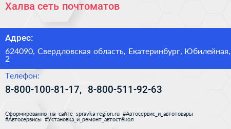 Халва, сеть почтоматов по адресу 624090, Свердловская область, Екатеринбург, Юбилейная, 2 в дальнейшем Организация, размещена в следующих категориях: