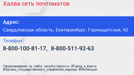 Халва, сеть почтоматов по адресу Свердловская область, Екатеринбург, Горнощитская, 42 в дальнейшем Организация, размещена в следующих категориях: