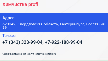 Химчистка profi по адресу 620042, Свердловская область, Екатеринбург, Восстания, 99 в дальнейшем Организация, размещена в следующих категориях: