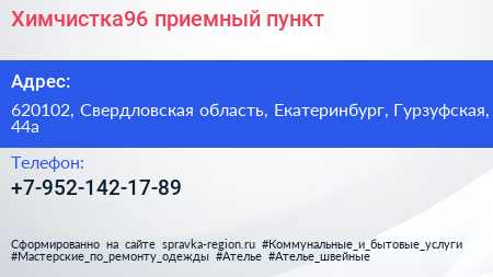 Химчистка96, приемный пункт по адресу 620102, Свердловская область, Екатеринбург, Гурзуфская, 44а в дальнейшем Организация, размещена в следующих категориях: