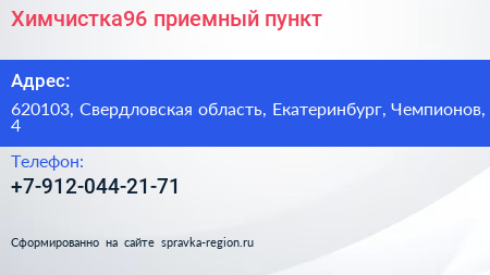 Химчистка96, приемный пункт по адресу 620103, Свердловская область, Екатеринбург, Чемпионов, 4 в дальнейшем Организация, размещена в следующих категориях: