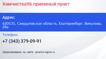 Химчистка96, приемный пункт по адресу 620131, Свердловская область, Екатеринбург, Викулова, 28а в дальнейшем Организация, размещена в следующих категориях: