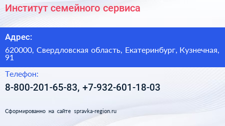 Институт семейного сервиса по адресу 620000, Свердловская область, Екатеринбург, Кузнечная, 91 в дальнейшем Организация, размещена в следующих категориях: