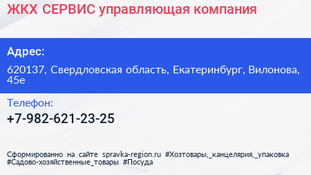 ЖКХ-СЕРВИС, управляющая компания по адресу 620137, Свердловская область, Екатеринбург, Вилонова, 45е в дальнейшем Организация, размещена в следующих категориях: