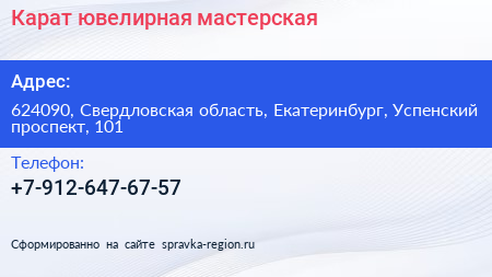 Карат, ювелирная мастерская по адресу 624090, Свердловская область, Екатеринбург, Успенский проспект, 101 в дальнейшем Организация, размещена в следующих категориях:
