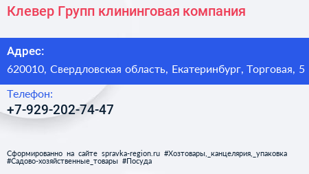 Клевер Групп, клининговая компания по адресу 620010, Свердловская область, Екатеринбург, Торговая, 5 в дальнейшем Организация, размещена в следующих категориях:
