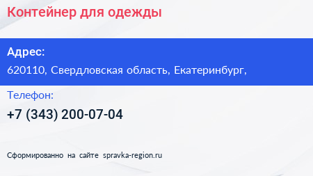 Контейнер для одежды по адресу 620110, Свердловская область, Екатеринбург, в дальнейшем Организация, размещена в следующих категориях: