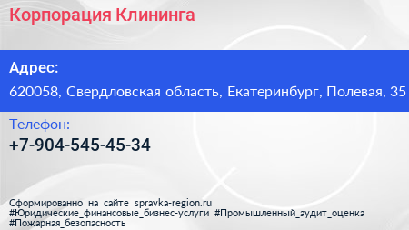 Корпорация Клининга по адресу 620058, Свердловская область, Екатеринбург, Полевая, 35 в дальнейшем Организация, размещена в следующих категориях: