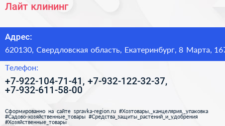 Лайт клининг по адресу 620130, Свердловская область, Екатеринбург, 8 Марта, 167 в дальнейшем Организация, размещена в следующих категориях: