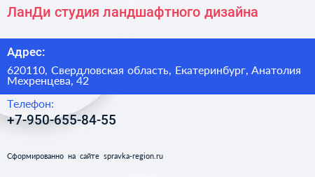 ЛанДи, студия ландшафтного дизайна по адресу 620110, Свердловская область, Екатеринбург, Анатолия Мехренцева, 42 в дальнейшем Организация, размещена в следующих категориях: