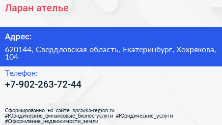 Ларан, ателье по адресу 620144, Свердловская область, Екатеринбург, Хохрякова, 104 в дальнейшем Организация, размещена в следующих категориях: