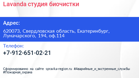 Lavanda, студия биочистки по адресу 620073, Свердловская область, Екатеринбург, Луначарского, 194, оф.114 в дальнейшем Организация, размещена в следующих категориях: