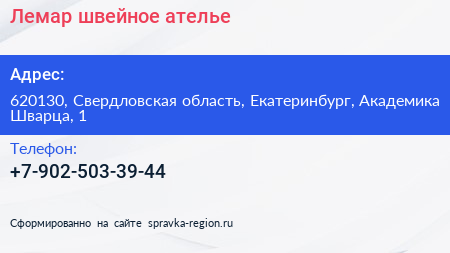 Лемар, швейное ателье по адресу 620130, Свердловская область, Екатеринбург, Академика Шварца, 1 в дальнейшем Организация, размещена в следующих категориях: