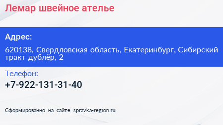 Лемар, швейное ателье по адресу 620138, Свердловская область, Екатеринбург, Сибирский тракт дублёр, 2 в дальнейшем Организация, размещена в следующих категориях: