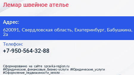 Лемар, швейное ателье по адресу 620091, Свердловская область, Екатеринбург, Бабушкина, 2а в дальнейшем Организация, размещена в следующих категориях: