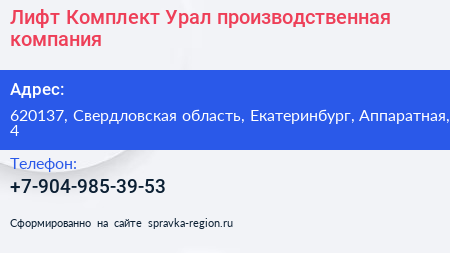 Лифт Комплект Урал, производственная компания по адресу 620137, Свердловская область, Екатеринбург, Аппаратная, 4 в дальнейшем Организация, размещена в следующих категориях: