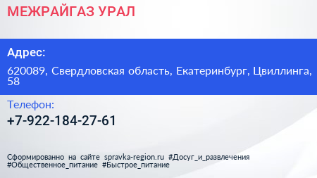 МЕЖРАЙГАЗ-УРАЛ по адресу 620089, Свердловская область, Екатеринбург, Цвиллинга, 58 в дальнейшем Организация, размещена в следующих категориях: