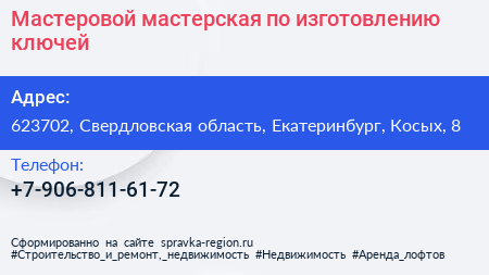 Мастеровой, мастерская по изготовлению ключей по адресу 623702, Свердловская область, Екатеринбург, Косых, 8 в дальнейшем Организация, размещена в следующих категориях: