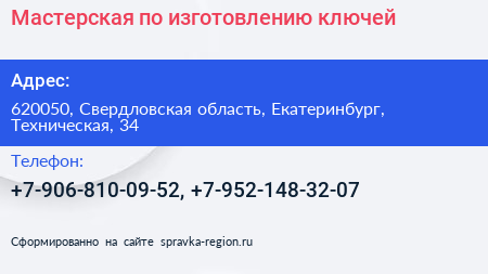 Мастерская по изготовлению ключей по адресу 620050, Свердловская область, Екатеринбург, Техническая, 34 в дальнейшем Организация, размещена в следующих категориях: