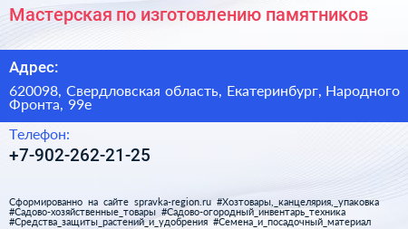 Мастерская по изготовлению памятников по адресу 620098, Свердловская область, Екатеринбург, Народного Фронта, 99е в дальнейшем Организация, размещена в следующих категориях: